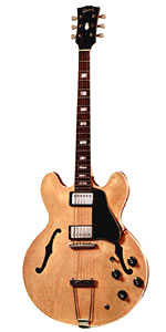 FEATURES: Semi-acoustic body, with solid hard-rock maple center piece. Laminated maple neck. Beautiful Brazilian rosewood fingerboard with miniature block pearloid inlays. Exclusive adjustable truss rod. Decorative, inlay mother-of-pearl peghead. Chrome-plated parts. Tune-O-Matic bridge. Twin chrome-plated Humbucking pickups. Master volume control. Master mixer control. Three-position toggle switch. 1: Normal position for standard guitar sounds, 2: on or out phase tonalities, 3: stand-by position. 16" wide, 19" long, 1 3/4" thin: 24 3/4" scale, 22 frets.