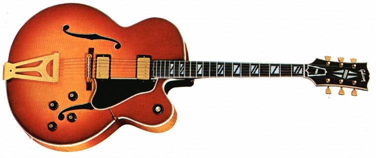 FEATURES: Carved top of finest spruce, carved back of figured curly maple with matching rims. Five-piece curly maple neck, adjustable truss rod. Ebony fingerboard, pearl block inlays. Adjustable Tune-O-Matic bridge. Exclusive Super 400 tailpiece. Powerful twin Humbucking pickups. Separate tone and volume control for each pickup which can be preset. Three position toggle switch to activate either or both pickups. Hand-bound custom pickguard. Gold-plated metal parts. Deluxe individual machine heads. 18" wide, 21 ¾ " long, 3 3/8 " deep; 25 ½ " scale, 20 frets.