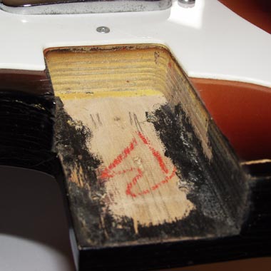 The laminate body of this bass is visible in the unfinished neck pocket, and (less obviously) on the body edge. Some middle period Vox's (generally the later British built ones) had dates, or other markings stamped in the neck pocket, although not in this case. Laminate wood construction was a standard feature of most early sixties solid body Vox guitars, but by 1964/65 pretty much all guitars leaving the Vox factory had a one-piece agba or mahogany body.