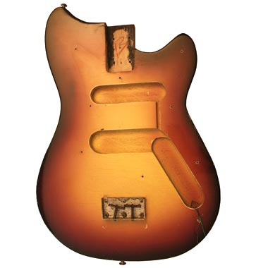 This image shows two Bassmaster bodies - top: this 1963 Bassmaster with plywood body, bottom: a 1965 Bassmaster with solid mahogany body. Note the difference in curvatures between the two edges. This rounded profile was just one example of how UK Vox guitars improved as the decade progressed.
