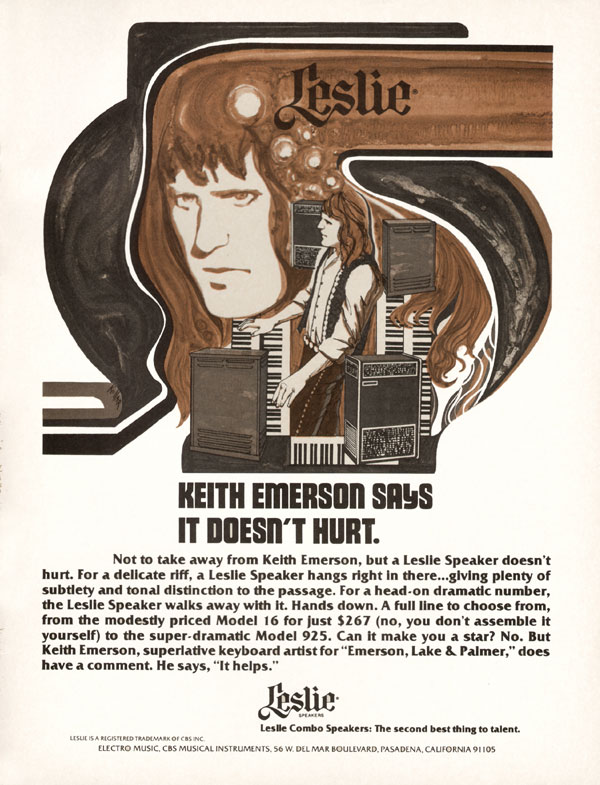 Not to take away from Keith Emerson, but a Leslie Speaker doesn't hurt. For a delicate riff, a Leslie Speaker hangs right In there...giving plenty of subtlety and tonal distinction to the passage. For a head-on dramatic number, the Leslie Speaker walks away with it. Hands down. A full line to choose from, from the modestly priced Model 16 for just $267 (no, you don't assemble it yourself) to the super-dramatic Model 925. Can It make you a star? No. But Keith Emerson, superlative keyboard artist for "Emerson, Lake & Palmer," does have a comment. He says, "It helps."