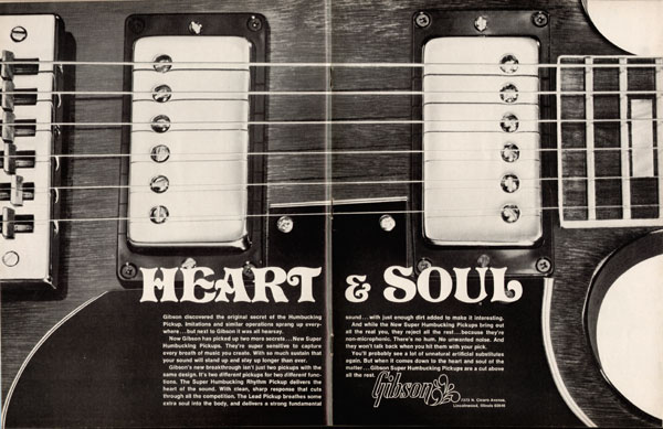 Gibson discovered the original secret of the Humbucking Pickup. Imitations and similar operations sprang up everywhere ... but next to Gibson it was all hearsay. Now Gibson has picked up two more secrets... New Super Humbucking Pickups. They're super sensitive to capture every breath of music you create. With so much sustain that your sound will stand up and stay up longer than ever. Gibson's new breakthrough isn't just two pickups with the same design. It's two different pickups for two different functions. The Super Humbucking Rhythm Pickup delivers the heart of the sound. With clean, sharp response that cuts through all the competition. The Lead Pickup breathes some extra soul into the body, and delivers a strong fundamental sound... with just enough dirt added to make it interesting. And while the New Super Humbucking Pickups bring out all the real you, they reject all the rest... because they're non-microphonic. There's no hum. No unwanted noise. And they won't talk back when you hit them with your pick. You'll probably see a lot of unnatural artificial substitutes again. But when it comes down to the heart and soul of the matter... Gibson Super Humbucking Pickups are a cut above all the rest.