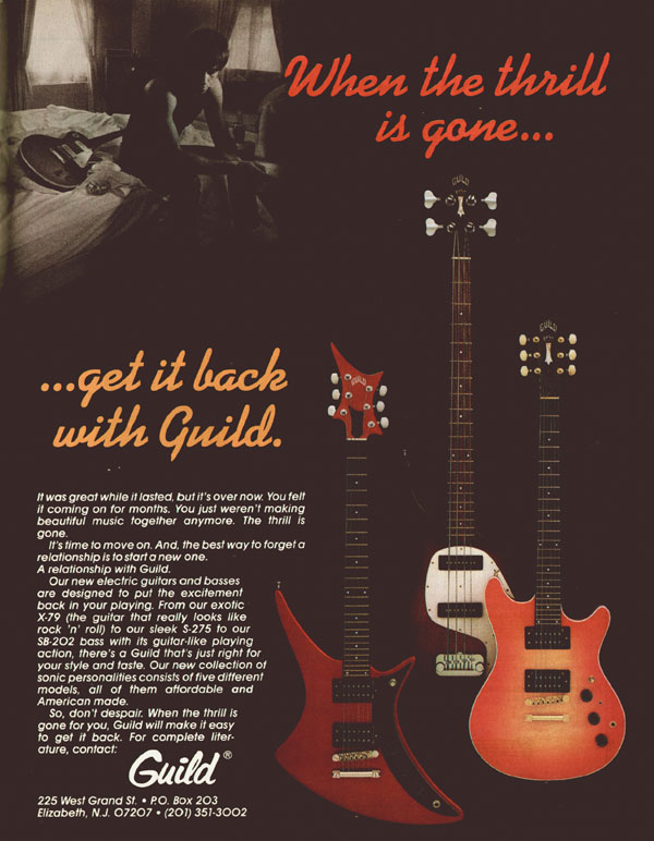 The three models featured in this advertisement were all new, and completely 1980s... The outrageous X-79, with it's matching body and headstock shapes, the admittedly more conforming S-275 and the SB-202 bass.
