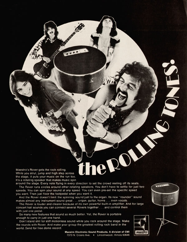 The Rover runs circles around other rotating speakers. You don't have to settle for just two speeds. You can spin your sound at any speed You can even pre-set the specific speed you want. Then just floor the footpedal when you want it. And the Rover doesn't limit the spinning sound just to the organ. Its new "rounder" sound makes almost any instrument sound great. . . organ, guitar, horns . . . even vocals. The Rover is louder and clearer because of its own powerful built-in amplifier. And for large concert hall sounds you can connect several Rovers together. . . and control them with just one pedal.