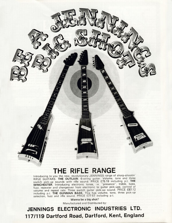 The Jennings rifle range was an unusual series of guitars and bass inspired by guns. Jennings was of course the British company that had created Vox guitars and amplifiers before selling the brand in 1967. This advert apopeared in the December 1971 issue of beat Instrumental magazine.