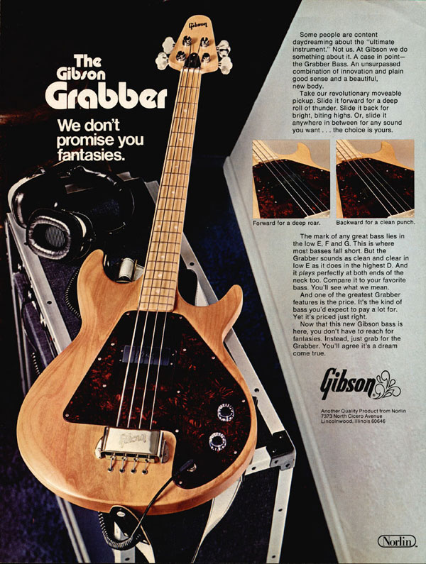 The bass featured is an interesting model, with very red tortoiseshell pickguard, and the engraved bridge cover positioned upside down (presumably to allow the Gibson logo to be the correct way round for the photograph). This advert (as was the grabber itself, with its bolt-on neck, and alder or maple Fenderesque body shape) was clearly aimed at the Fender buying market, acknowledging that Gibson basses are not your favourite!