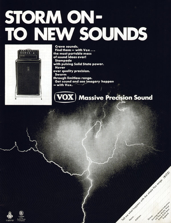 Advertisement likening the (then) new Vox solid state amplifiers to a thunder storm.