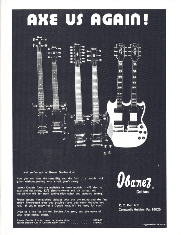 . . . and you've got an Ibanez Double Axe! Now you can have the versatility and the flash of a double neck guitar without parting with a half year's salary. Ibanez Double Axes are available in three models ? 4/6 electric bass and six string, 12/6 electric twelve and six strings, and the all-new 6/6 for open tuning slide guitar and standard tuning. Power-wound humbucking pickups pour out the sound and the fast action fingerboard gives you playing speed you never thought you had. If you're ready for a Double Axe, it'll be ready for you. Drop us a line for the full Double Axe story and the name of your local Ibanez dealer.
