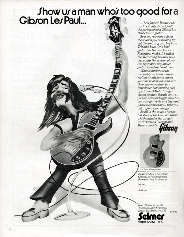 UK ad for the Triumph bass and Les Paul Recording guitar. The add was produced by Selmer who were the British distributors of Gibson Instruments. This was a widely used advert in 1974 Britain, appearing in numerous magazines as early as Jan 1974 through to February 1975.
