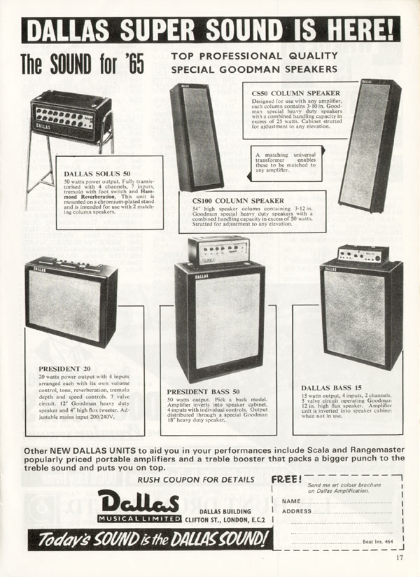 1965 Dallas advert featuring 3 guitar amplifiers and the Solus 50 PA and 2 speaker columns (CS-50 and CS-100). The guitar amps are the President 20, President Bass 50, and the Dallas Bass 15
