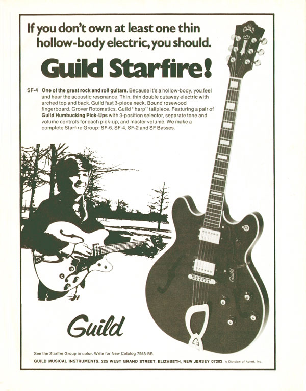 Advert for the S-90, S-100 SF-V (starfire) and M75 Guild six strings