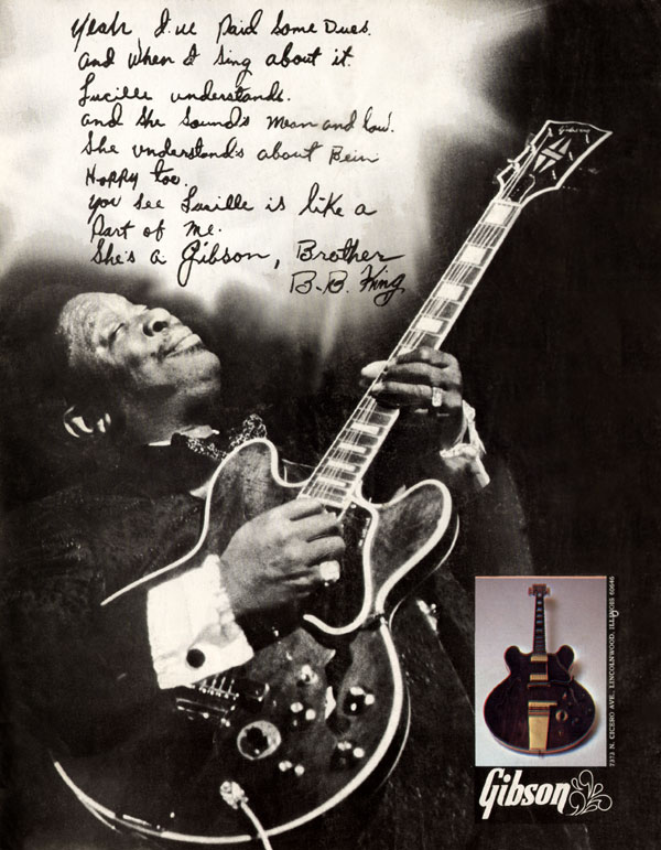 BB King endorsed Gibson products for many years and featured in numerous catalogs and adverts; always playing an ES-355TD-SV or the BB King Lucille guitar - basically an ES-355 but without f-holes, in order to reduce feedback whilst performing. He can be seen here bending a note on an ES-355TD-SV. More about BB King and Gibson.
