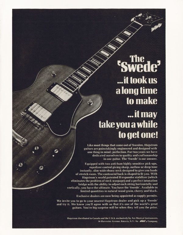 Like most things that come out of Sweden, Hagstrom guitars are painstakingly engineered and designed with one thing in mind; perfection. For two years we have dedicated ourselves to quality and craftsmanship in one guitar. The 'Swede' is our answer. Equipped with two anti-hum highly sensitive pick-ups, equalizer control giving sharp, mellow or deep tone instantly, slim wide ebony neck designed to give you loads of stretch room. The contoured back is shaped to fit you. With Hagstrom's world patented H expander stabilizer (which eliminates the problem of neck warpage) and a perfect intonation bridge with the ability to adjust each string horizontally and vertically, you have the ultimate. You have the 'Swede'. Available in limited quantities in natural wood grain, cherry and black. Exclusive dealers are now being appointed as supply permits. We invite you to go to your nearest Hagstrom dealer and pick up a 'Swede' and try it. We know you'll agree with us that it's one of the world's great guitars. You're big surprise will be when they tell you the price