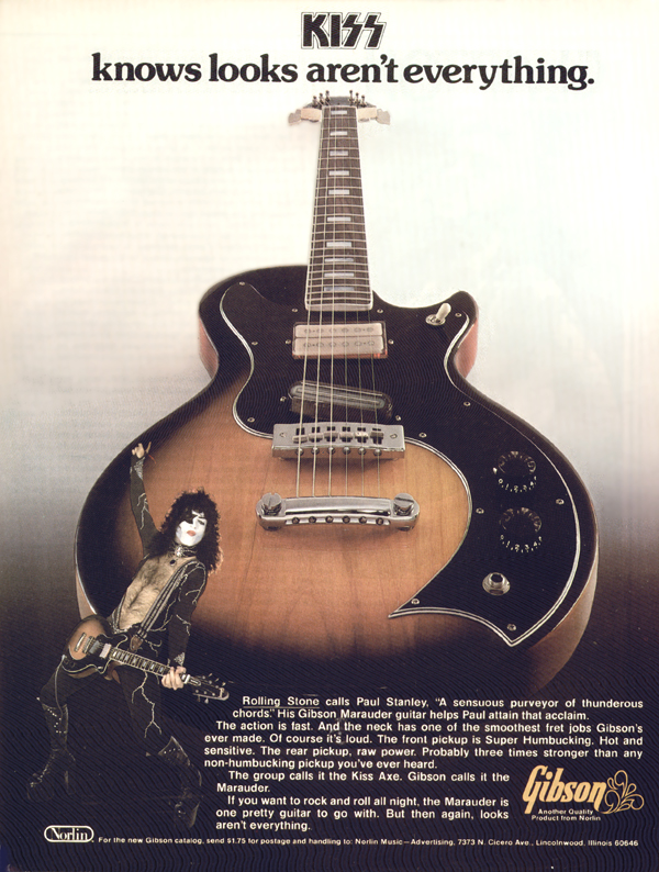 Rolling Stone calls Paul Stanley, "A sensuous purveyor of thunderous chords" His Gibson Marauder guitar helps Paul attain that acclaim. The action is fast. And the neck has one of the smoothest fret jobs Gibson's ever made. Of course it's loud. The front pickup is Super Humbucking. Hot and sensitive. The rear pickup, raw power. Probably three times stronger than any non-humbucking pickup you've ever heard. The group calls it the Kiss Axe. Gibson calls it the Marauder. If you want to rock and roll all night, the Marauder is one pretty guitar to go with. But then again, looks aren't everything