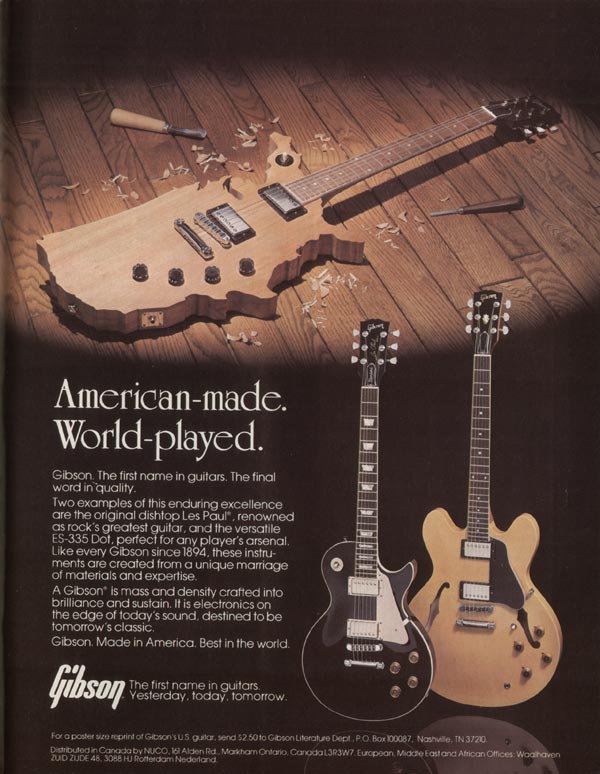 This advertisement was widely used circa 1982-1984. It features the American map guitar that appears on the cover of the 1983 Gibson catalogue, alongside the ES-335 dot, and Les Paul Standard.