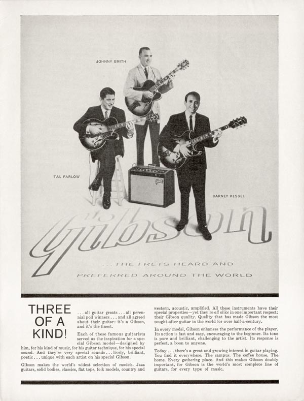 Advert for three Gibson Artist Acoustics; each being played by the jazz musician that gave it its name. Johnny Smith, Tal Farlow and Barney Kessel