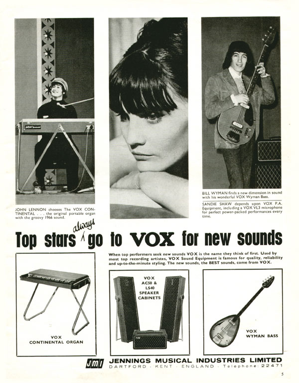 British Vox advert from 1966. In the mid 1960s Vox equipment was widely used by many of the big acts of the day, and this advert underlines this fact; John Lennon uses a Vox continental organ, Sandy Shaw uses a Vox PA, and Bill Wyman of the Rolling Stones introduces the Wyman bass that was built especially for him. Probably the first signature bass guitar.