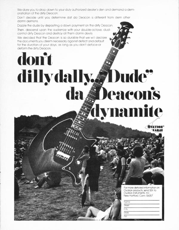Mid seventies advert for the Deacon. The model shown is an early version with the large single coil pickups, as opposed to the later double coil 12 pole piece version