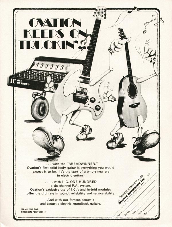 Early Ovation advertisement announcing their first solid-body electric guitar, the Breadwinner
