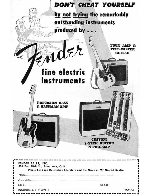 Early fifties advertisement underlining the modern features of the Fender Precision bass, and bassman amplifier