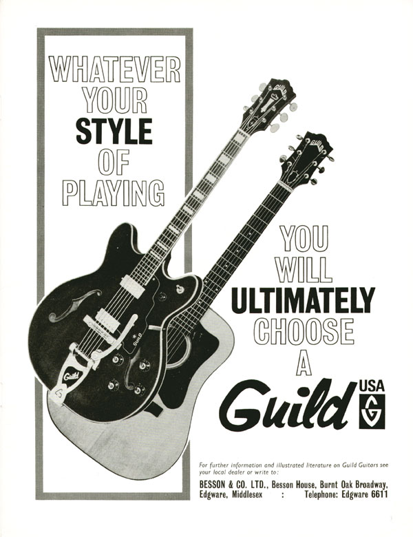 Advert for the S-90, S-100 SF-V (starfire) and M75 Guild six strings