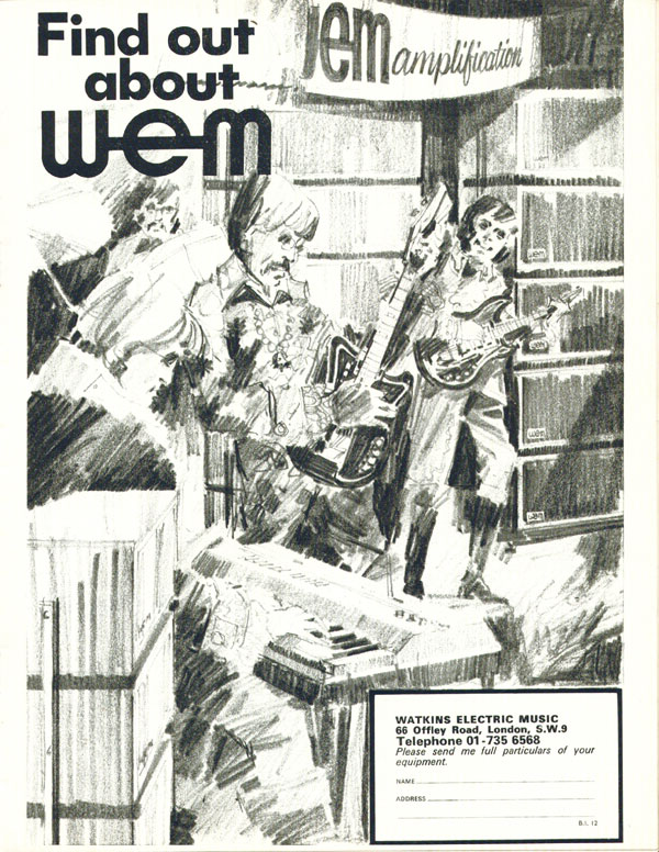 Illustration for UK amplifier maker WEM (Watkins Electric Music). Although titled 'Find Out About WEM', Watkins were not a new operation, however they were certainly expanding into PA gear, rather than solely instrument amplifiers. In the February 1968 issue of Beat Instrumental (that also featured this ad), Watkins announced a series of WEM sit-ins at London's Marquee club, "they give groups the chance to hear the complete range of WEM equipment, as it would sound on stage".