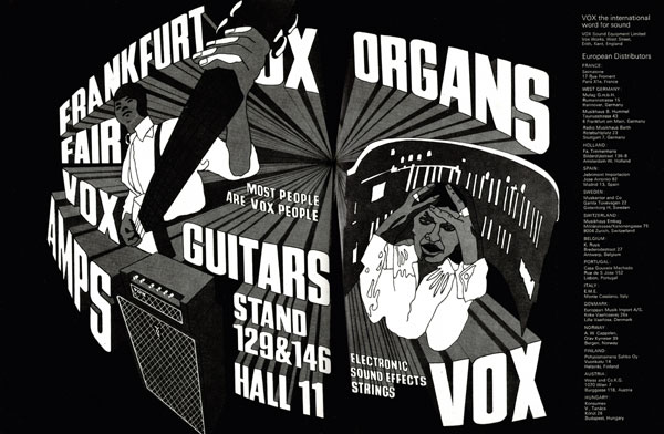 1966 British advertisement for Vox amplifiers featuring the new Vox semi-acoustic teardrop electric guitar, the Spitfire Mark VI