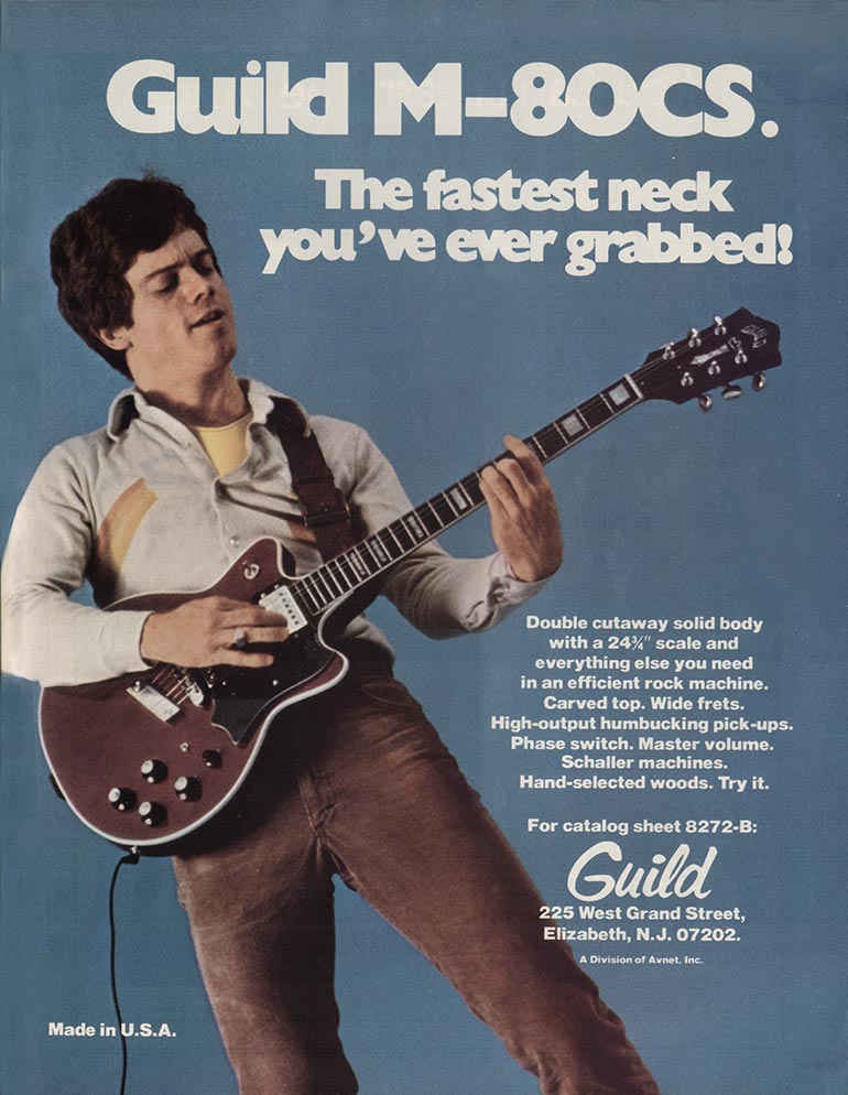 The Guild M-80CS was launched in 1975 as a double cutaway version of the Guild M-75CS. This, in turn, descended from the semi-hollow M-75 Bluesbird. Hence M-80CS; C denoting chrome hardware and S denoting a solid body.