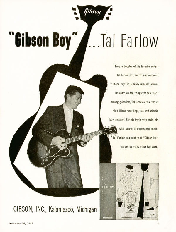 Truly a booster of his favourite guitar, Tal Farlow has written and recorded "Gibson Boy" in a newly released album. Heralded as the "brightest new star" among guitarists, Tal justifies ths title in his brilliant recordings, his enthusiastic jazz sessions.