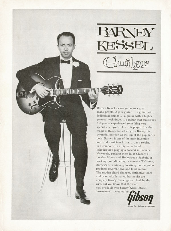 This early sixties advert for the new Barney Kessel guitars shows Barney playing the Barney Kessel Custom. That is the maple-necked version of this guitar. The Barney Kessel Regular has a neck made of mahogany.
