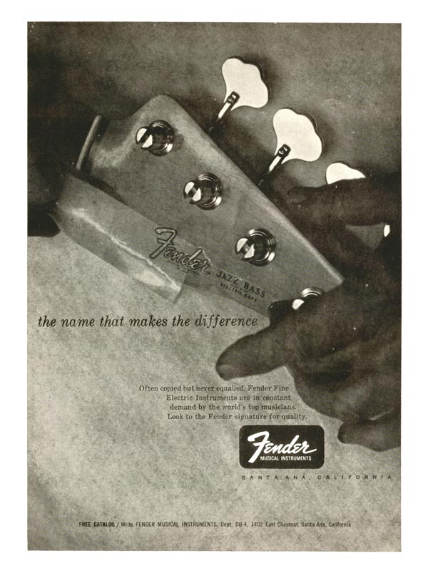 This mid sixties advert shows a Fender decal being applied to a Jazz bass. Despite the model depicted, this is really an advert for the Fender company rather than any individual model.