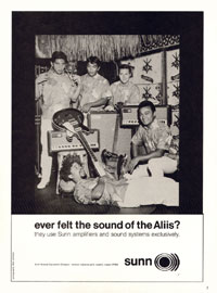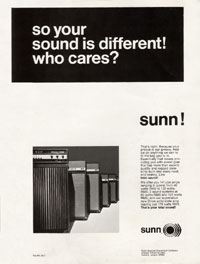 Sunn endorsed a lot of great bands in the late 1960s, but this advert features merely the name of Buffalo Springfield, on a drum case. The amplifier pictured is a Sunn sonic II.