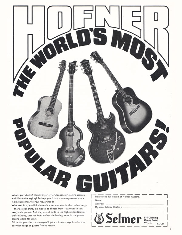 Advertisement for the range of Hofner guitars available in 1967 - showing an example of a Spanish-style acoustic (Hofner Vienna), a bass (500/1 violin 'Beatle' bass), a thinline electric acoustic (the Verithin) and a flat top Country and Western-style acoustic (model 491).