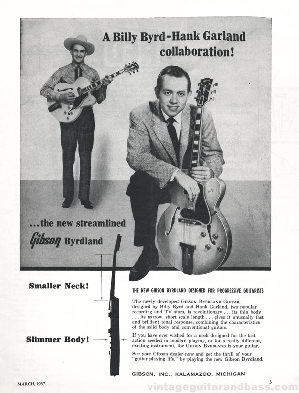 The earliest print advertisement for Gibson's first 'artist' guitar, from March 1957: the 'new streamlined' Byrdland - named after Billy Byrd and Hank Garland who collaborated in the design of this guitar.