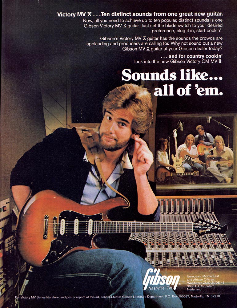 Mid-late eighties advertisement for Gibson's new Victory MV (or Multi-Voice) series of guitars. Though the MVII is mentioned, the MVX is the real focus of the advert. With it's Fenderesque body style and three pickups, the MV X was aimed at Stratocaster users.