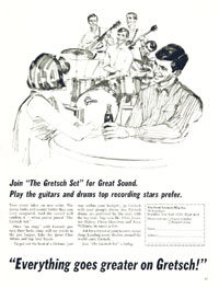 This advert for Gretsch guitars and drums highlights the Count Basie rhythm section of Freddie Green on guitar and Sonny Payne on drums. Freddie Green is pictured with the Gretsch Eldorado.