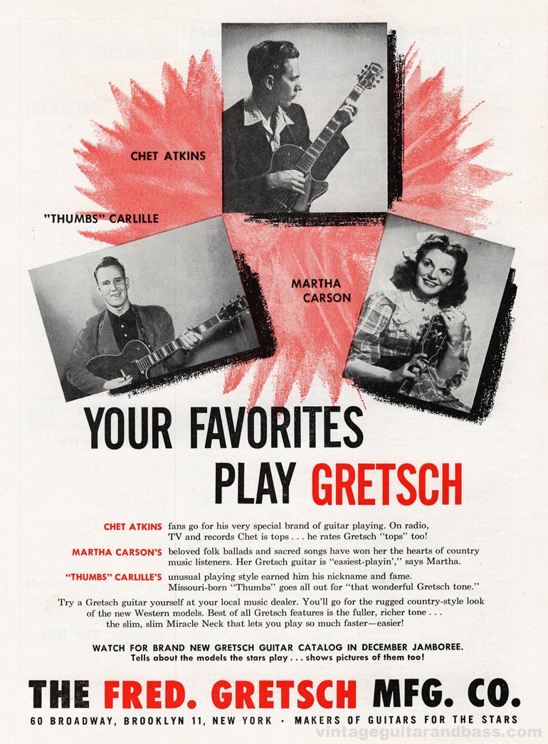 Gretsch advertisement from late 1955, featuring three Gretsch endorsing Country artists: Chet Atkins, with his then brand new Chet Atkins 6121 solid body; "Thumbs" Carlille with another solid body, a Gretsch Duo Jet; and balladeer Martha Carson.