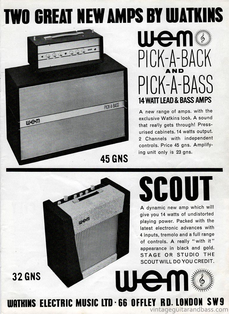 This advert from a 1963 British music magazine highlights two new Watkins amplifiers: the 14w 'piggy back' Pick-a-Back, head with 12" Pick-a-Bass cabinet, and the Scout combo, also 14w, but fitted with a 10" speaker.