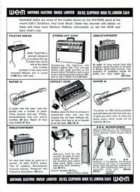 Mid sixties advertisement for WEM/ Watkins gear. Although a number of amplifiers, keyboards and guitars are illustrated, the main focus is on the 30w control HR30 head and the 2x12" Starfinder cabinet.