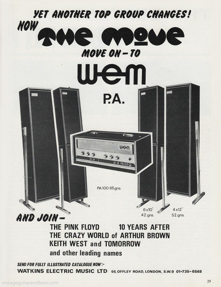 "Yet another top group changes". Early 1968 advert for WEM PA equipment, and the bands utilizing it: The Move, The Pink Floyd, 10 Years After, The Crazy World of Arthur Brown, Keith West and Tomorrow.