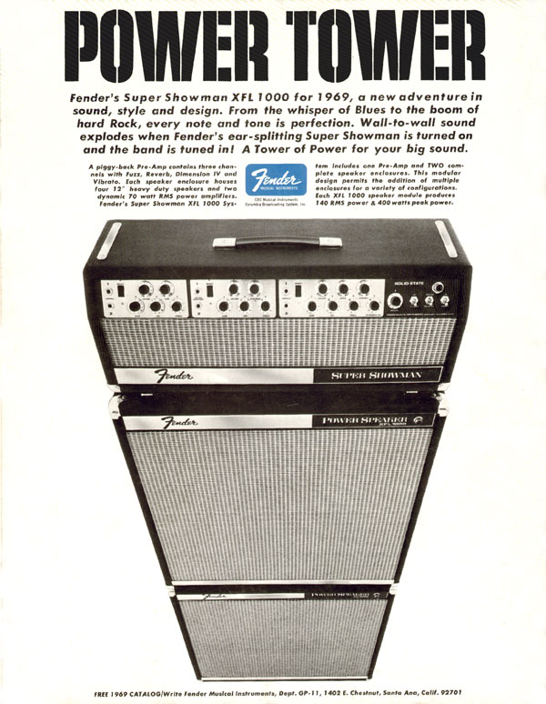 Fender's Super Showman XFL1000 for 1969, a new adventure in sound, style and design. From the whisper of Blues to the boom of hard Rock, every note and tone is perfection. Wall-to-wall sound