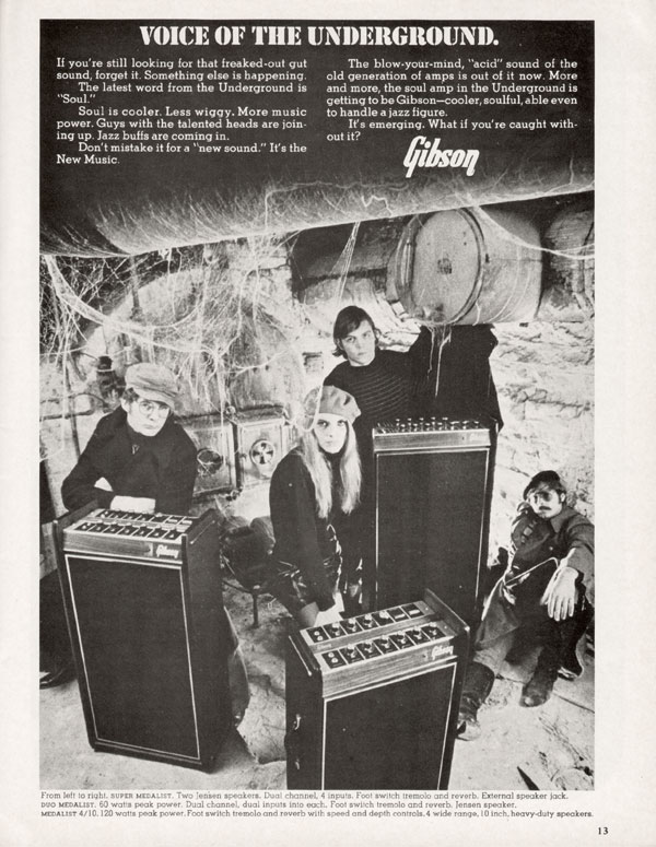 If you're still looking for that freaked-out gut sound, forget it. Something else is happening. The latest word from the Underground is "Soul." Soul is cooler. Less wiggy. More music power. Guys with the talented heads are joining up. Jazz buffs are coming in. Don't mistake it for a "new sound." It's the New Music. The blow-your-mind, "acid" sound of the old generation of amps is out of it now. More and more, the soul amp in the Underground is getting to be Gibson?cooler, soulful, able even to handle a jazz figure. It's emerging. What if you're caught without it?
