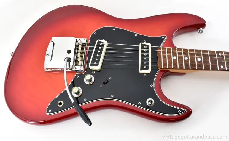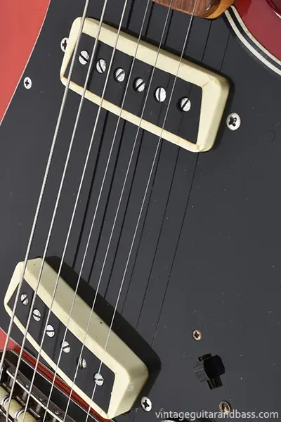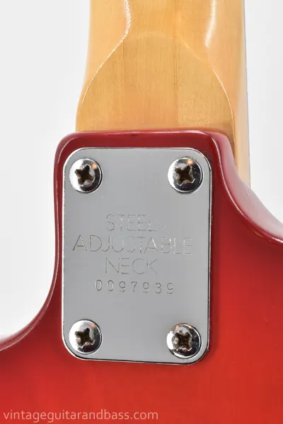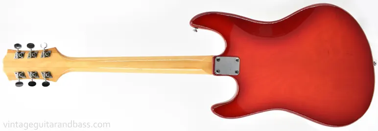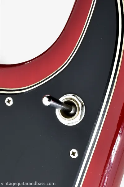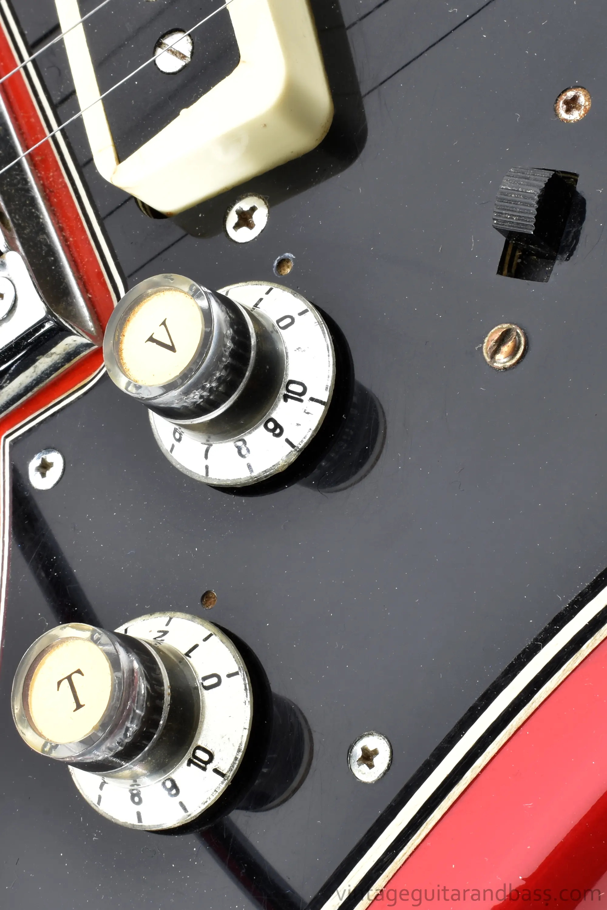Double cutaway, cherry red finish, hardwood adjustable neck, rosewood fingerboard with dot inlays, two pickups, toggle switch, tone switch, volume and tone control, vibrola, chrome plated hardware.
