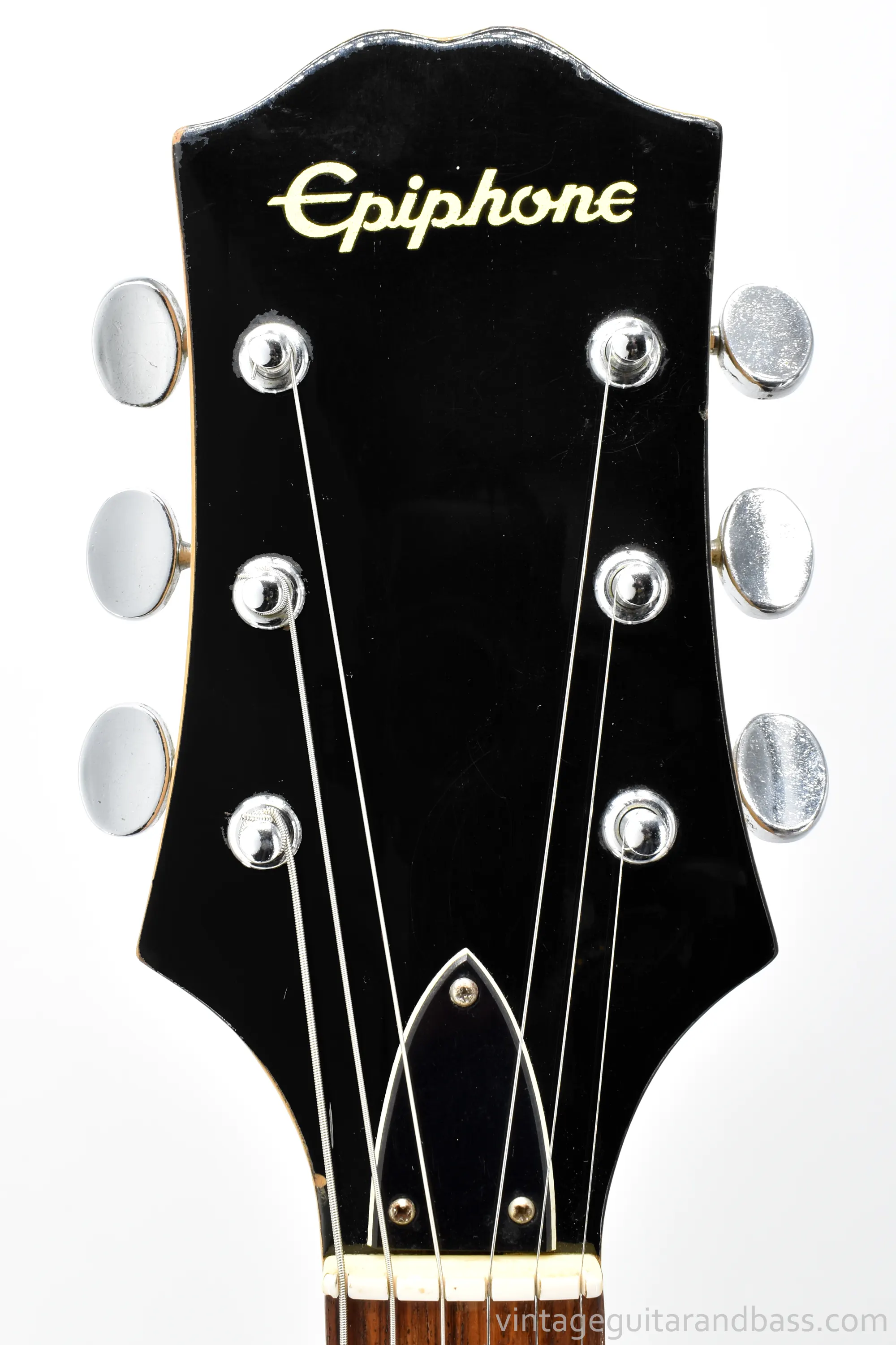 Epiphone 1802T headstock front. The Epiphone logo is silk-screened onto the headstock. Sometime between late-1971 and mid-1972 this was changed to a pearl inlay, with the price rising slightly and the name changing from 1802T to ET-270 about the same time.