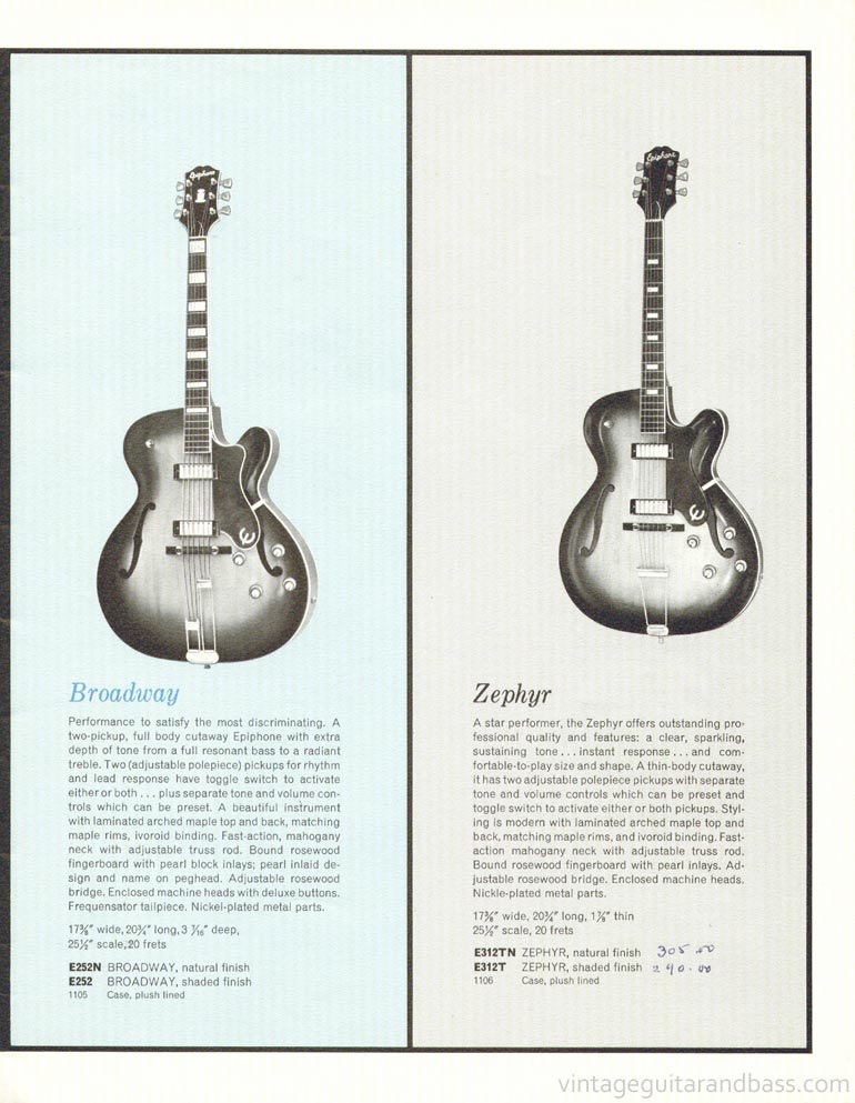 Epiphone 1961 full line catalog, page 5. Details of the Epiphone Broadway, (E252), and Epiphone Zephyr (E312T). These two guitars were very similar in a number of ways, sharing hardware, controls, body width and scale; the key difference was body depth, with the Zephyr being a thinline version of the full-body Broadway. The Broadway did also have some extra neck and headstock ornamentation, aswell as the Epiphone frequensator tailpiece, as shown here.