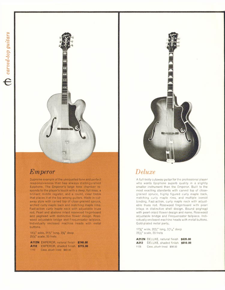 Epiphone 1962 'guitars, basses, amplifiers' catalog, page 16. Two beautiful carved top fully acoustic guitars, the Epiphone Emperor acoustic (A112) and Deluxe acoustic (A212), both available in Shaded (Sunburst), or Natural finish - at a slight premium. Both finishes are shown below. These really were beautiful instruments, built to a very high standard. Both had the same shape, scale, and very similar appointments, including gold-plated hardware, though the Deluxe was a slightly smaller instrument with a 17 3/8" body width, as opposed to the wider 18 1/2" of the Emperor.