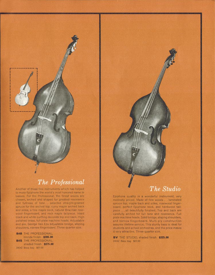 Another of those fine instruments which has helped to make Epiphone the worlds most honoured name in basses. For the Professional, the finest woods are chosen, arched and shaped for greatest resonance and fullness of tone⦠Selected straight-grained spruce for the arched top, curly maple arched back and sides, a fine maple neck , natural Brazilian rosewood fingerboard , and rock maple tailpiece . inlaid black and white purfling decorate top and back. High polished brass, full plate machine heads. Adjustable end pin, George Van Eps adjustable bridge, sloping shoulders, narrow fingerboard. Three-quarter size