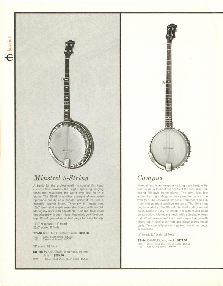 Epiphone 1962 'guitars, basses, amplifiers', page 20. Epiphone Minstrel, Plantation and Campus banjos.