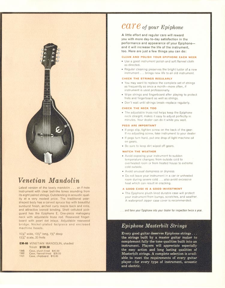 Epiphone 1962 'guitars, basses, amplifiers', page 21. Epiphone Venetian mandolin.
