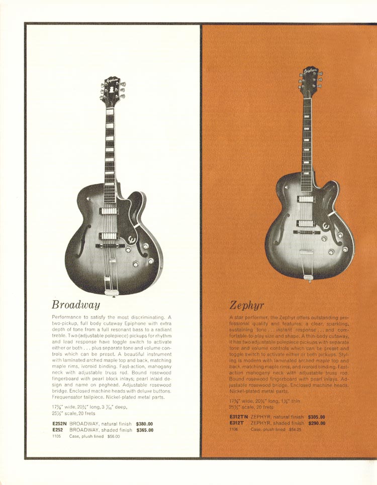 Epiphone 1962 'guitars, basses, amplifiers' catalog, page 4. Details of the Epiphone Broadway (E252), and Epiphone Zephyr (E312T). These two models were structurally the same guitar, save for body depth; the full-body (3 7/16") Broadway versus the thinline (1 7/16") Zephyr. The Broadway did have some extra ornamentation: headstock and fingerboard inlays, pickguard edging and frequensator tailpiece.